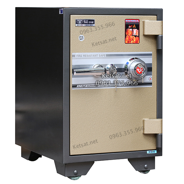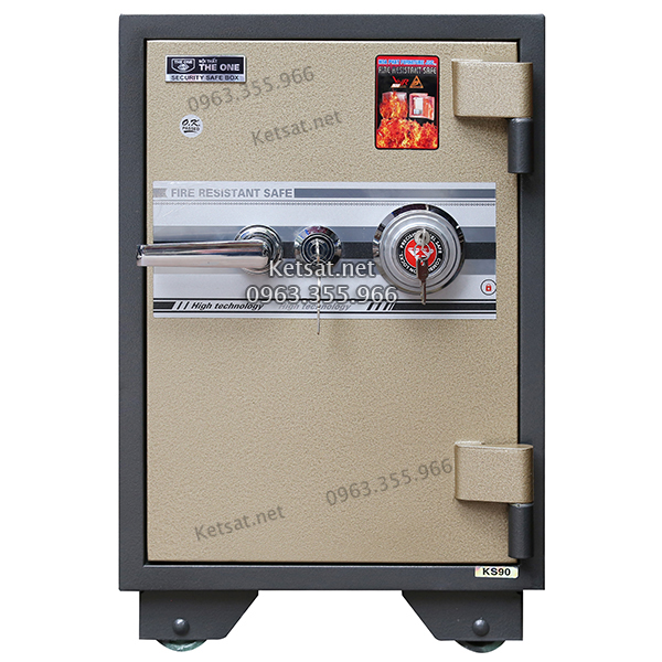 Két sắt chống cháy KS90-Royal Hòa Phát The One. Két có 1 ổ khóa chìa và 1 ổ khóa mã số cơ - có thể đổi mã tùy thích; bên trong két có 01 ngăn kéo.