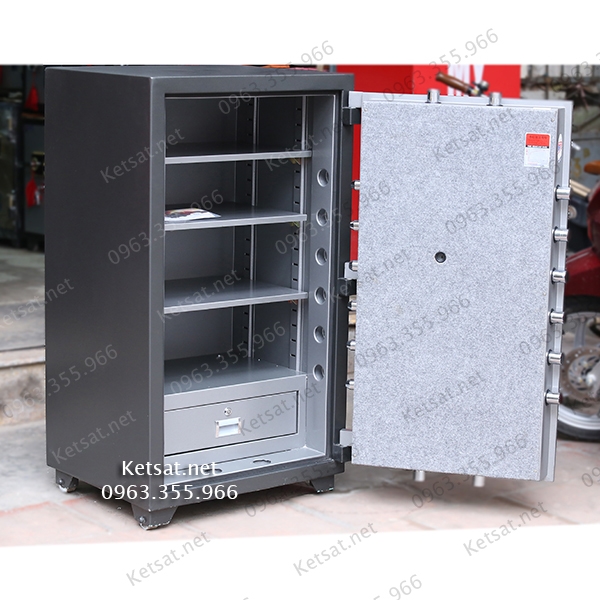 + Thân két gồm 2 lớp thép mạ điện (GA) + đá + thép hạt và hỗn hợp chất cách nhiệt chịu được nhiệt độ cao, chống đục phá tốt.