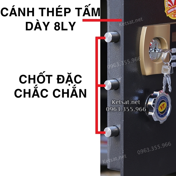 - Điểm khác biệt lớn nhất là ở cánh cửa cấu tạo từ thép tấm dày 8ly với dàn 6 chốt đặc 20mm tạo độ cứng vững chống cạy phá cho két sắt, cửa két được thiết kế bản lề ngoài bằng thép tấm dày 4mm, tạo góc mở 180 độ rất thuận tiện sự dụng.