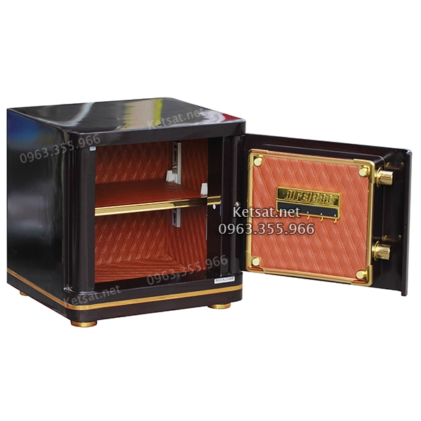 - Bên trong két được sơn Nano phủ bóng 3 lớp. Phía trên các vách ngăn và xung quanh thành két được phủ bằng một lớp da cao cấp trần tỉ mỉ hình quả trám. Màu da nâu vừa tạo cảm giác sạch sẽ, vừa đem đến sự sang trọng, đẳng cấp cho người nhìn.