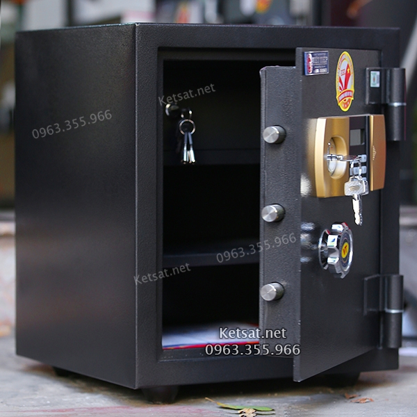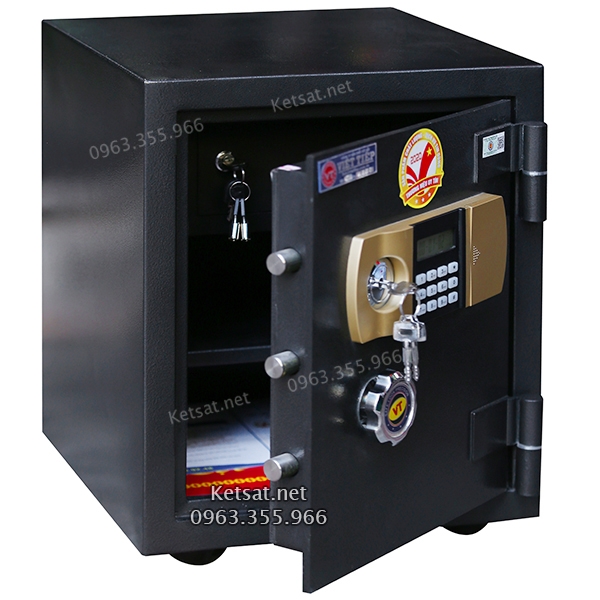 - Khóa mã: khóa chìa 4 cạnh chống sao chép + điện tử có báo động - báo động khi kẻ gian mở két, cạy phá két.
