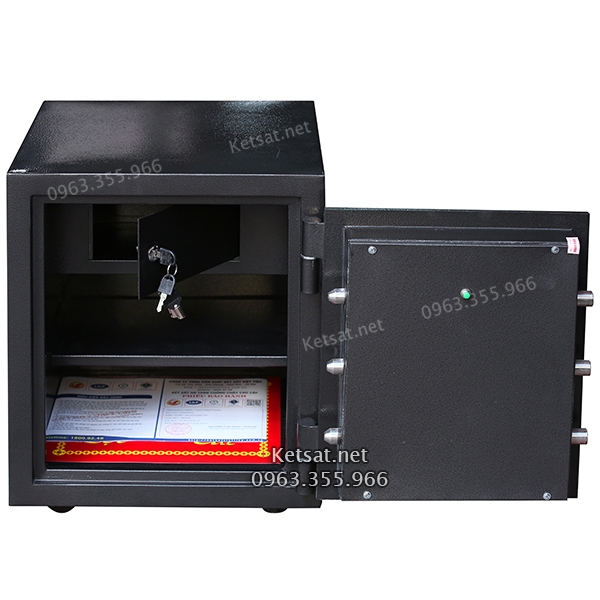 - Nội thất bên trong két được thiết kế rất khoa học với 1 đợt di động chia ngăn để giấy tờ + 1 ngăn phụ có khóa chìa là nơi cất giữ đồ quý giá rất tiện lợi.